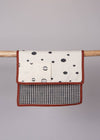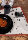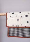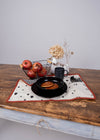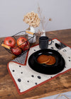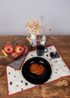 Ogni pezzo è cucito a mano, rendendo ogni tovaglietta unica. Fantasia a pois e scacchetti per un doppio stile. Tasca a contrasto con un pois vuoto.
