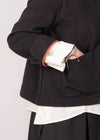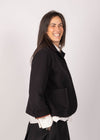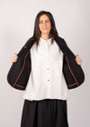 La giacca Ingrid è l’evoluzione della nostra storica Ninetta. Abbiamo ampliato la linea a trapezio, chiuso gli spacchi laterali, arrotondato e smussato le punte frontali, aggiungendo un piccolo collo a lancia per addolcire e contenere la figura. È stata mantenuta la caratteristica manica con paramontura sul polsino. La giacca è arricchita internamente da rifiniture con sbieco in puro cotone.