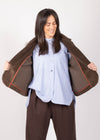 La giacca Ingrid è l’evoluzione della nostra storica Ninetta. Abbiamo ampliato la linea a trapezio, chiuso gli spacchi laterali, arrotondato e smussato le punte frontali, aggiungendo un piccolo collo a lancia per addolcire e contenere la figura. È stata mantenuta la caratteristica manica con paramontura sul polsino. La giacca è arricchita internamente da rifiniture con sbieco in puro cotone.