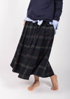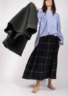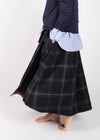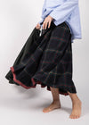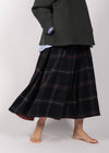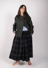 Gonna portafoglio Isabella in pura lana con motivo tartan su fondo gianduia, arricchito da scacchi nei toni burro e peperoncino. I larghi piegoni su un lato donano movimento al volume, mentre la cintina con asola in vita consente di regolare la vestibilità in base alla propria taglia. Una tasca applicata sul fianco sinistro completa il design con un dettaglio funzionale e discreto.