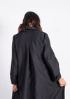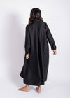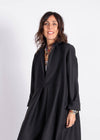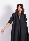 L'abito Viola 80% lana e 20% seta nasce dall'evoluzione del Violante, alleggerito da due pieghe al posto di quattro per accompagnare il movimento. È realizzato con raffinate tasche laterali, faldone sul retro, sbieco color blu e un collo simmetrico in sintonia con gli stessi volumi dell’originale. Il tessuto conferisce una perfetta architettura all'abito.