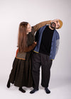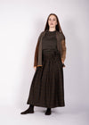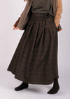 Gonna portafoglio Isabella in pura lana con motivo tartan su fondo gianduia, arricchito da scacchi nei toni burro e peperoncino. I larghi piegoni su un lato donano movimento al volume, mentre la cintina con asola in vita consente di regolare la vestibilità in base alla propria taglia. Una tasca applicata sul fianco sinistro completa il design con un dettaglio funzionale e discreto.