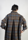 Le tasche asimmetriche rompono l’equilibrio in modo armonioso, dialogando con il colletto strutturato e il doppio taglio sul retro, pensato per accompagnare il movimento. Sul dietro, la bugia aggiunge volume e costruzione, creando una linea architettonica, forte e decisa, che rende il cappotto ancora più teatrale e distintivo.